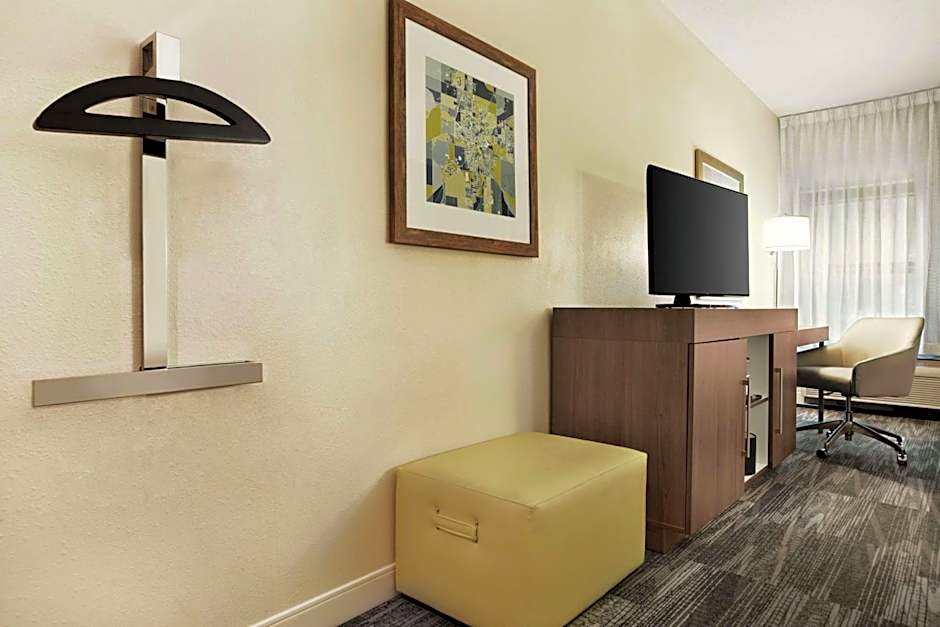 This room features plush bedding, cable TV, an ergonomic work desk and a refrigerator.
